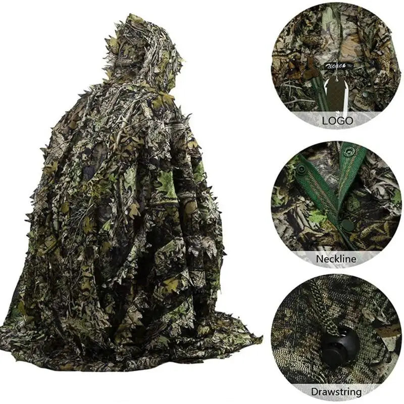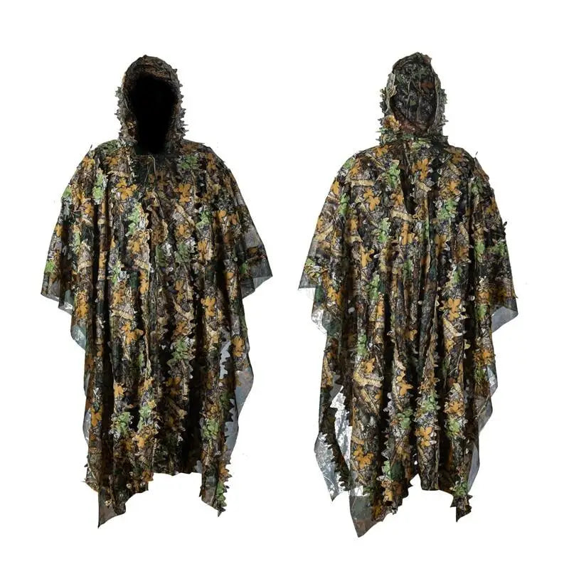 3D Camouflage Ghillie Cloak is a realistic, full-coverage camouflage cloak designed for hunters, wildlife photographers, bird watchers, and outdoor enthusiasts. Constructed from lightweight, breathable polyester, it features 3D simulated leaves for superior concealment in woodland or dark environments while remaining comfortable and easy to wear.