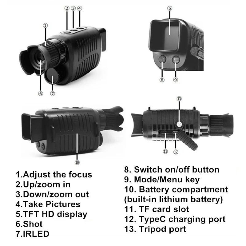 Compact, high-performance 1080P digital night vision monocular, Model 5X Digital, designed for versatile day and night observation. Equipped with 5X digital zoom, 7-level adjustable infrared illumination, and portable ergonomic design, it is perfect for hunters, wildlife observers, security professionals, and outdoor enthusiasts seeking a reliable, lightweight night vision device.
